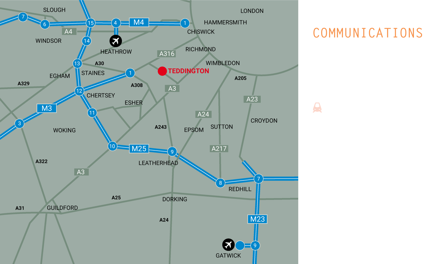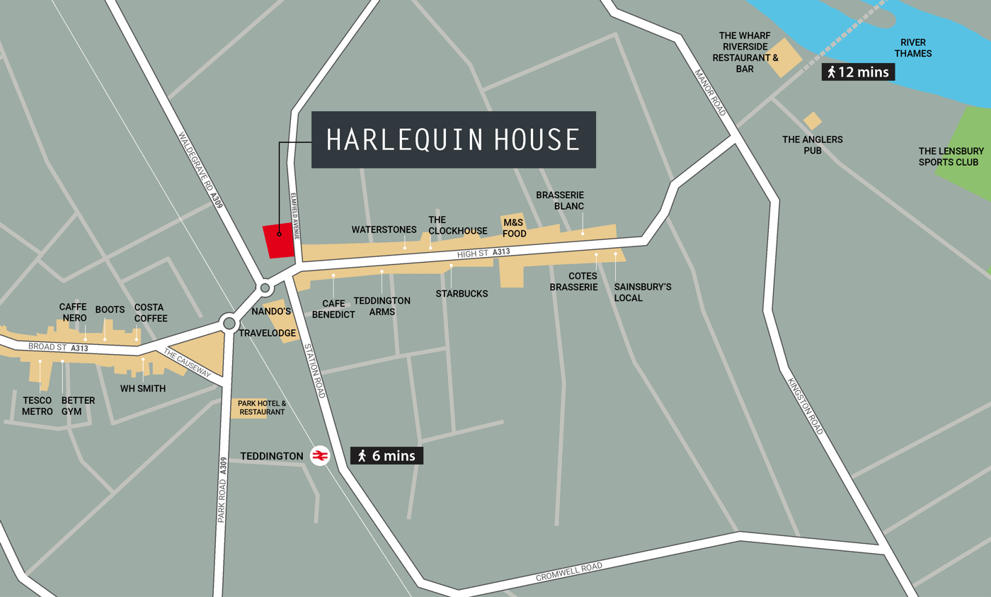 Harlequin House is prominently situated in Teddington Town Centre, on the junction of the High Street and Elmfield Avenue. Teddington is approximately 12 miles to the south west of central London and approximately 5 miles from Junction 1 of the M3 which provides access to the M25 and motorway network.